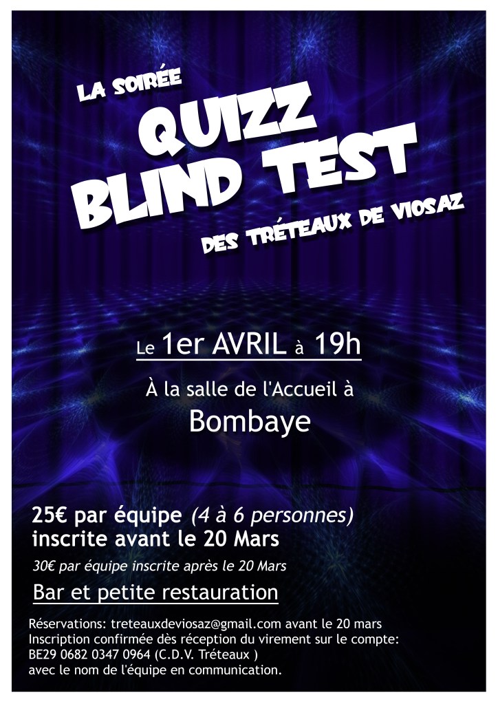Forts de cette expérience, nous vous convions le samedi 1 avril à nous rejoindre à Bombaye pour des séquences blind alternées à des séquences quizz (aux thèmes parfois inattendus). Ouverture des portes et petite restauration dès 19h, début des épreuves à 20h30. Possibilité de prolonger la soirée en musique à la fin du jeu.